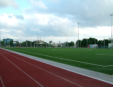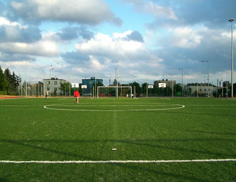 Duże boisko ze sztuczną trawą i pełnym oświetleniem o wymiarach 62x30m